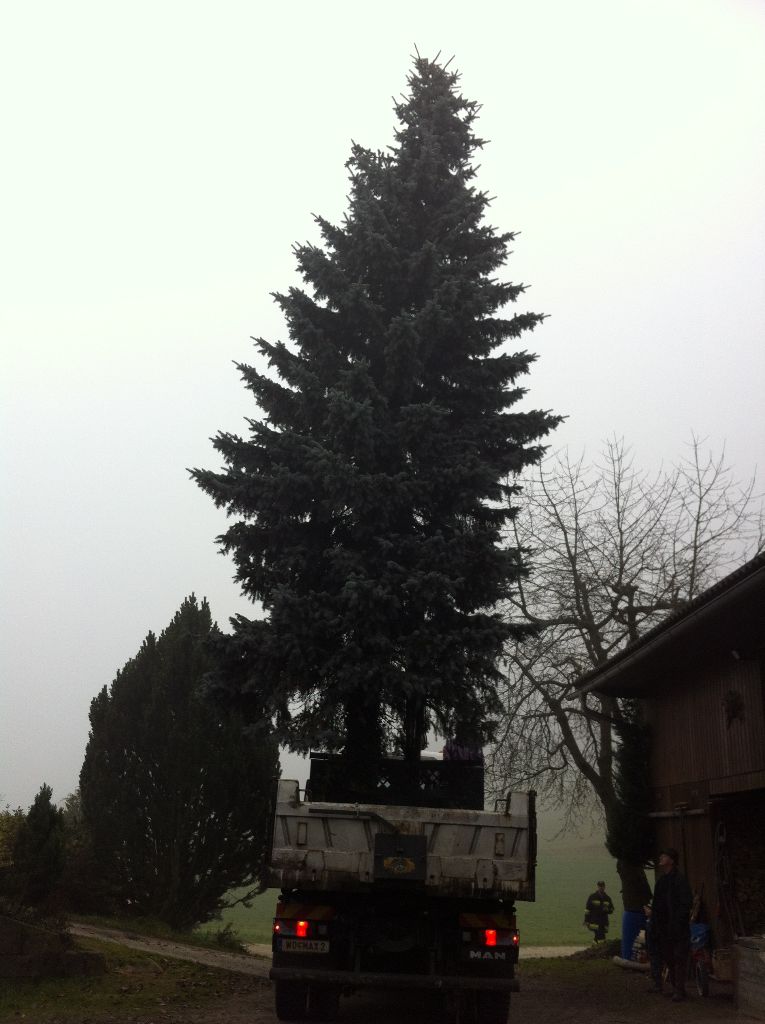OLM Wolfgang Schmerlaib war der verantwortliche Dienstgrad für das diesjährige Christbaumaufstellen. Mit seinem Team ging es am Samstagmorgen los, um den Christbaum für die Feuerwehr zu holen. Mit seinem LKW war Hannes Peinsitt, ein großer Gönner unserer Feuerwehr, wieder gerne bereit, den Baum zum Rüsthaus zu transportieren.