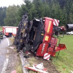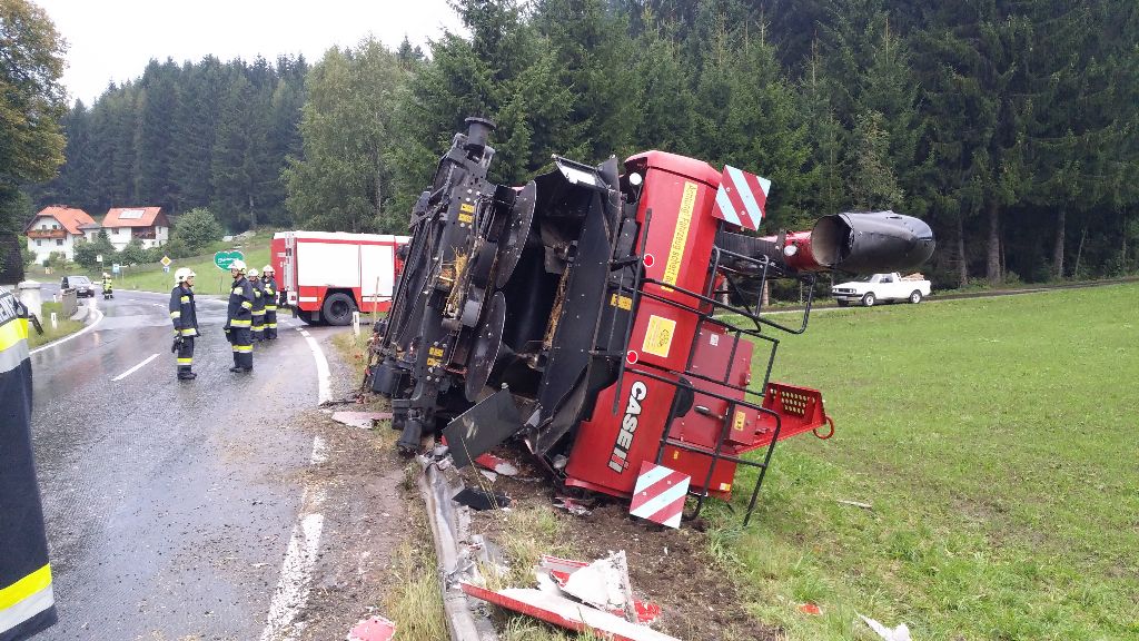 Gegen 18.15 Uhr kam es auf der B 78 knapp vor der steirischen Landesgrenze zu einem recht ungewöhnlichen Verkehrsunfall. In einer leichten Linkskurve hatte ein LKW aus bisher noch ungeklärter Ursache den auf dem Tieflader befindlichen Mähdrescher “verloren”. In der Folge kippte das 15 Tonnen schwere Erntegerät auf die Straßenböschung und blieb seitlich liegen.